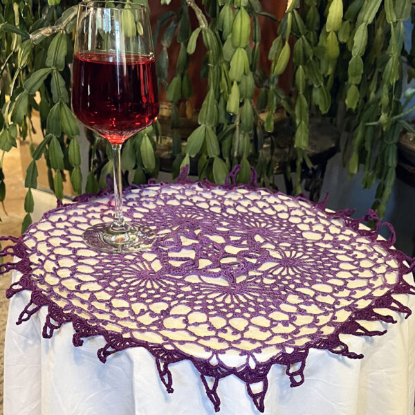 Purple with dark purple edge hand crocheted cotton doily for table decoration. Round cloth doilies can be great centerpiece decoration or great place-mats. Ready to ship doily sizes are about 18″.