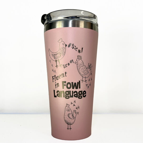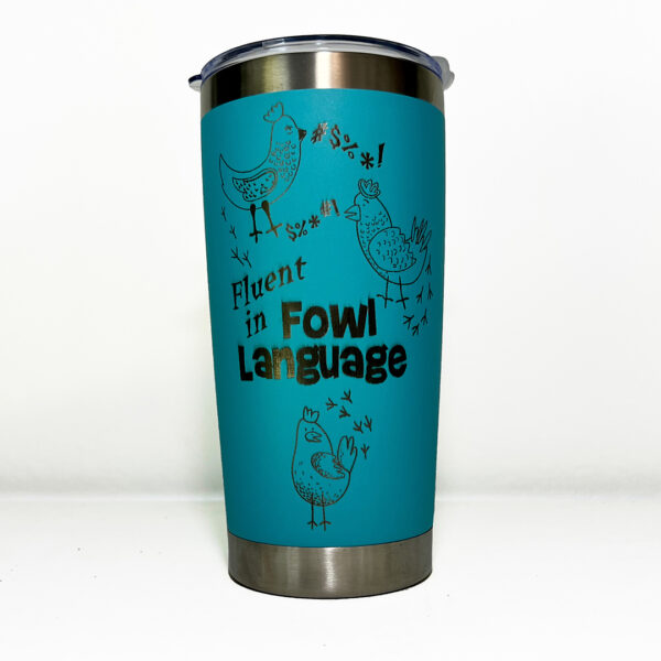 Fluent in Fowl Language laser etched on 20oz stainless steel double-walled insulated tumbler.