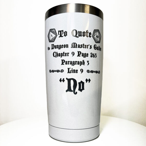 Sip your morning coffee, water, or favorite drink in style with this “To Quote Dungeon Master’s Guide, Chapter 9, Page 263, Paragraph 5, Line 9, NO” laser etched on a 20oz stainless steel tumbler in pearl white or dark teal.